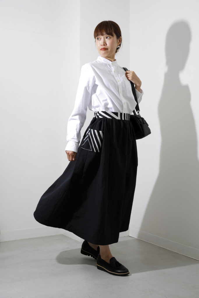 スカートはロング丈。ウエストベルトとポケットに風呂敷の生地を使っています。ベースはナイロン素材ですがさらっとした質感なので、暑い時期でも肌にまとわりつかず、軽やかな着心地です。