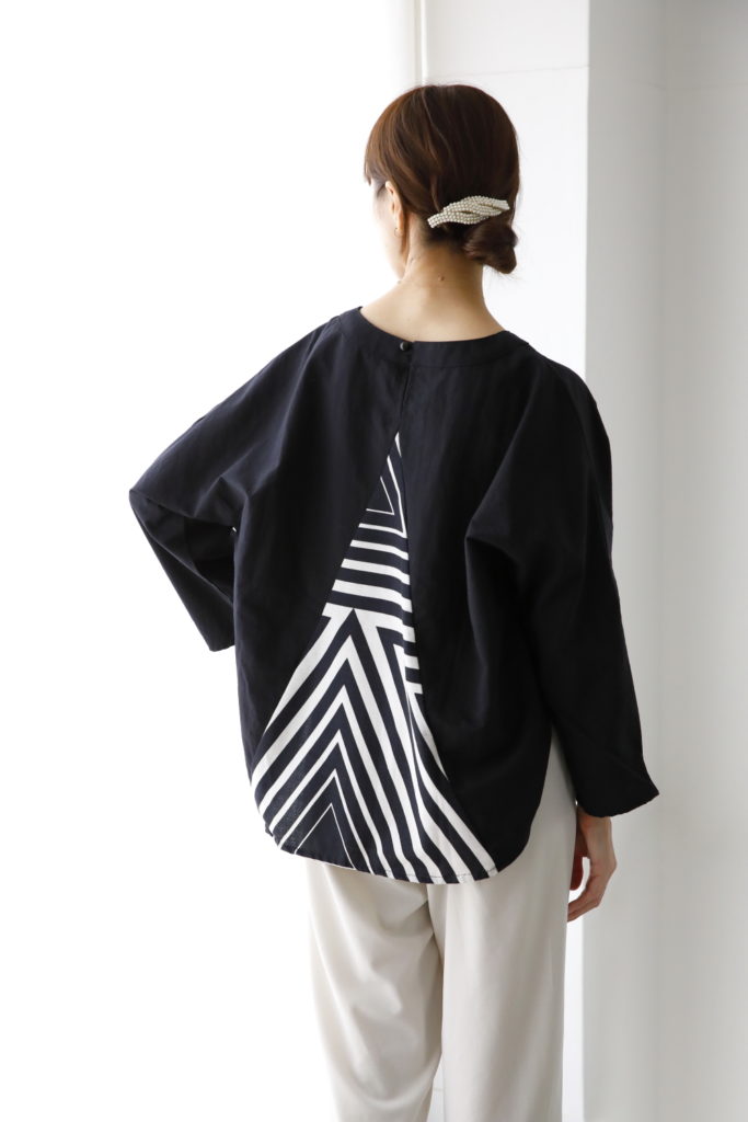 プルオーバータイプのブラウスは背中に風呂敷の生地を大胆にアレンジ。お尻がかくれる丈なのがうれしいポイント。